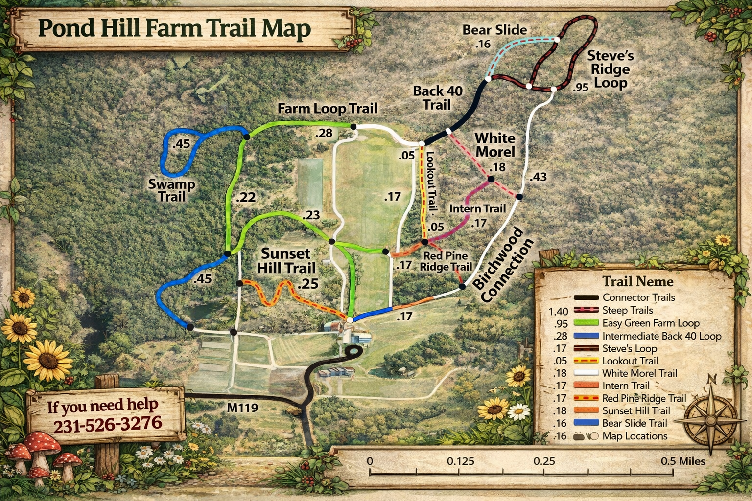 Our property is home to miles of groomed trails that are available for you to use free of charge! The easy loop features a gnome house hunt thatβs great for kiddos! Find the hidden gnome houses along the way and open the doors to find letters. Put them together to solve the secret code & win a prize down in our market.